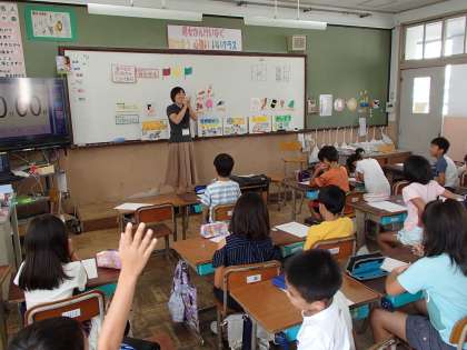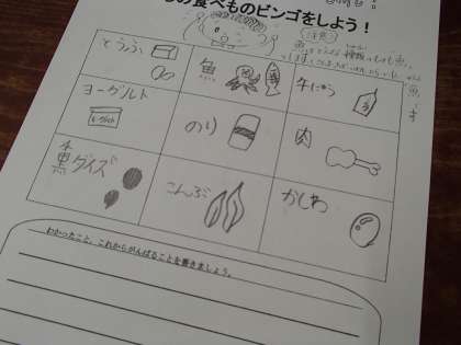 今日は3,4校時に食育があり,栄養教諭の先生が授業をして下さいました。赤い食べ物(タンパク質)をたくさん挙げて,それを9マスに書き分けてビンゴゲームをしました。担任と栄養教諭がカードを引く度,教室は阿鼻叫喚!大盛り上がりでした。