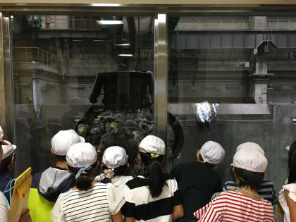 大きなクレーンでごみを運ぶ様子や,センターを管理するコンピューターがいっぱいある部屋などを見学しています。
