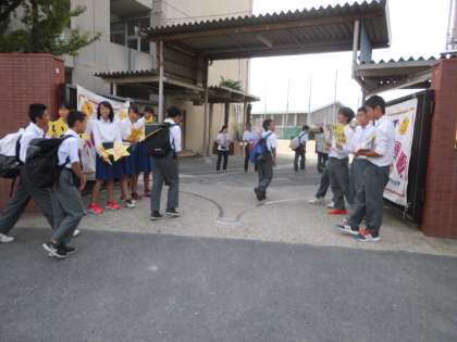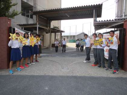 いいことばの日ののぼりは,今日,地域でも掲げていただいています。ありがとうございます。梅津中学校でも正門に生徒会のメンバーが立って,元気にあいさつしていました。