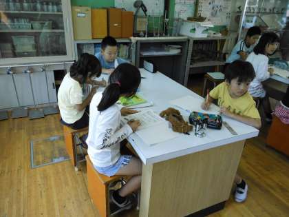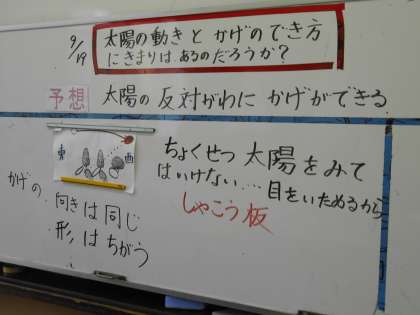 理科の学習で,「太陽の動きと地面のようす」について学習しています。今日は,自分たちもよく目にしているかげのでき方について考えました。またじっくりと影のできる様子を観察してみるのもいいですね。