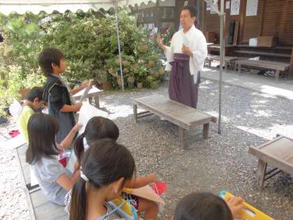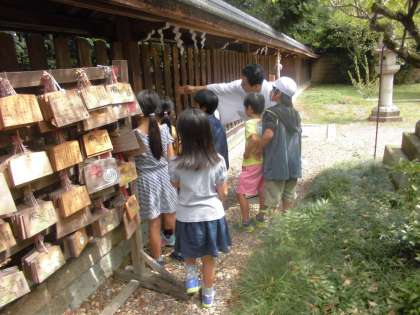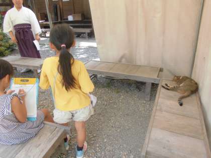 梅ノ宮大社にも探検に行きました。副宮司の方が、丁寧に質問に答えてくださいました。そばには、テレビで有名になった猫たちが悠然と寝ています。