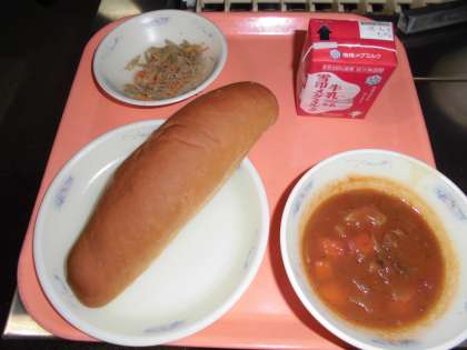 黒糖コッペパン・牛乳・トマトシチュー・ごぼうのソテー