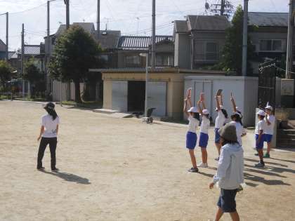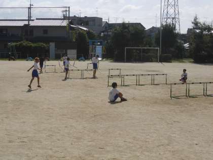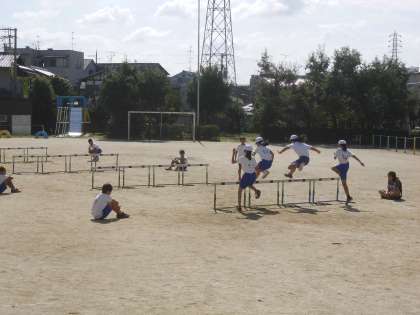 運動会練習,今日はハードル走です。自分に合ったインターバルでハードルを越えていきます。スピード感ある走りができているか,確かめながら練習していました。