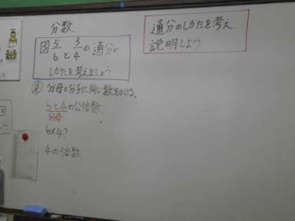 算数では,今日,通分の学習をしました。この学習は,分数のたし算やひき算を学習する際に大切になってくるところです。繰り返し練習して,確実にマスターしたいです。