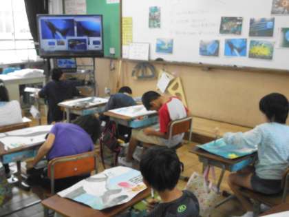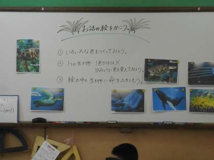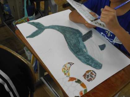 お話の絵の制作が進んでいます。クジラを絵の具できれいに描いていました。クジラ以外の小さな生き物も一つ一つていねいに色を塗って完成を目指しています。