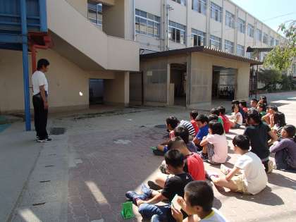 今日の4校時は,理科「太陽の光を調べよう」の学習でした。理科の濱本先生から手渡された手鏡をもって,中庭で太陽の光を反射させてみます。