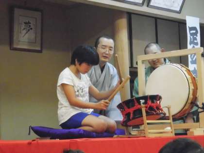落語に使う楽器も紹介してくれて,実際に太鼓をたたかせてもらいました。三味線と笛のリズムに合わせて太鼓をたたかせてもらいましたが,こちらはみんな上手にたたいていました。
