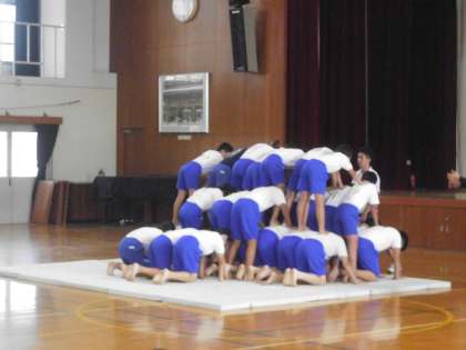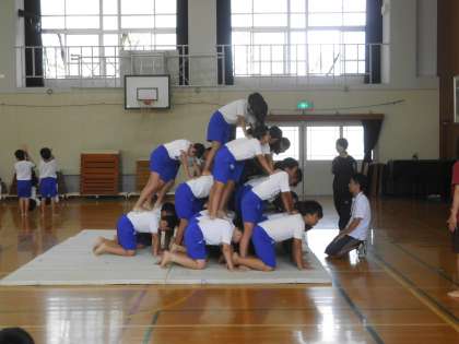 組体操の練習では,たくさんの人数で取り組む大きな技にも挑戦を始めています。これまで以上に,みんなで息を合わせていくことが大事になってきます。集中して引き続き頑張ります。