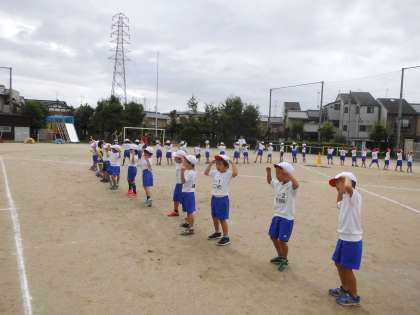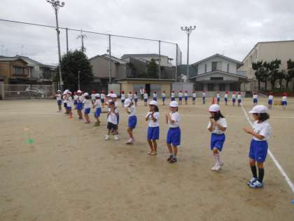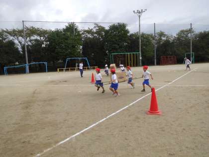 運動場で運動会の練習です。「おみこし ワッショイ!リレーだ ワッショイ!」の練習をしました。おみこしを持つグループのみんなで協力しないと,うまく進めません。お互いに声を掛け合いながら競技していました。競技の前にはダンスも披露してくれます。これもまた楽しみです。