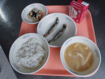 麦ごはん・ししゃものからあげ・五目煮豆・みそ汁