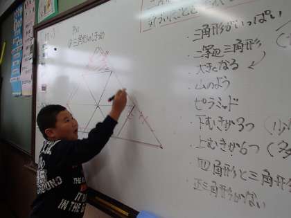 算数科「三角形」ではいよいよまとめの段階に入りました。今日は三角形のプレートを使って敷き詰める活動でした。「三角形が大きくなる」という抽象的な言い方を,みんなで考えながら説明し合いました。
