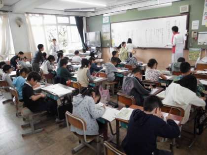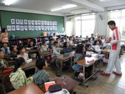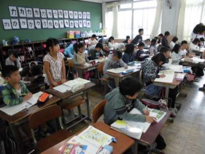 3年生は,教科によって1組と2組の担任の先生が交代して学習することがあります。写真は,1組の教室で2組の担任が外国語活動の学習を一緒にしている様子です。2組の教室では,1組の担任が理科を一緒に学習していました。子どもたちも気分を新たにして学習できるようで,何だか楽しそうです。