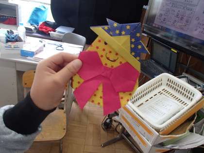 見せてくれたのは,折り紙で作ったたまごのキャラクター。図書ボランティアさんの読み聞かせ「たまごにいちゃん」を思い出しているのでしょうか。