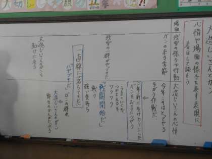 国語で「大造じいさんとガン」を読み進めています。5年生の国語の教科書に昔からある物語。今日はクライマックスの場面をみんなで読み深めていきました。