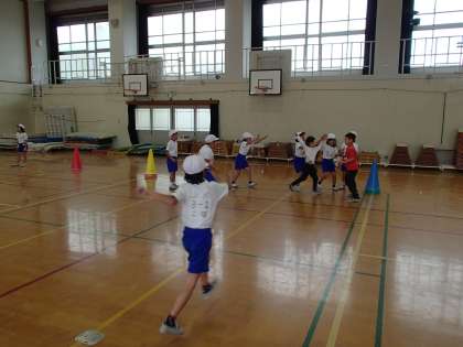 体育科では雨天のため,体育館での「エンドボール」を行いました。チーム分けをして,ゴールマンにボールを渡そうと懸命にコートを走っていました。「もっとやりたい!」と,やる気にあふれている3年生です。