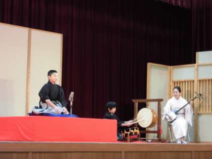 落語芸術協会の方々に来ていただき,全校で落語鑑賞です。まずは,6年生の代表児童による小噺。全校の前で,小噺,太鼓ともに,練習してきた成果をしっかり出し切ることができました。
