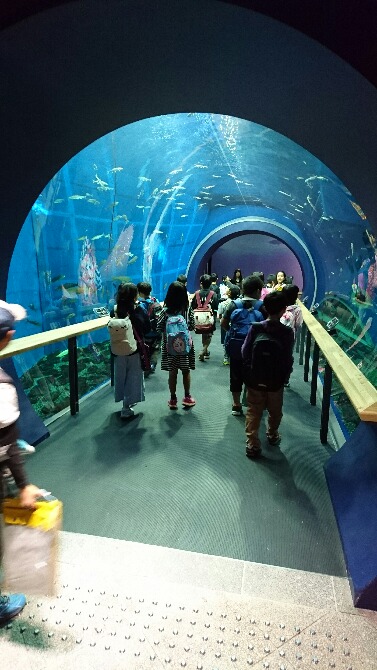 まずは、水族展示室へ。トンネル水槽をくぐり抜け、生き物とのふれあい、顕微鏡で微生物の観察などをしました。