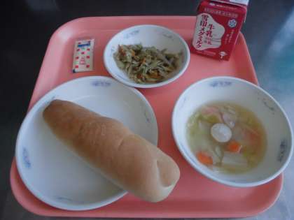 コッペパン・(国内産小麦100%)・牛乳・ツナごぼうサンド(具)・ソーセージと野菜のスープ煮
