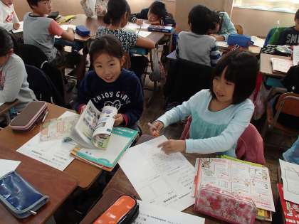 社会科では,週末に行ってきた社会見学のまとめをポスターに書いています。見てきた昔の道具や水族館の魚など,楽しそうに書く姿が微笑ましいです。