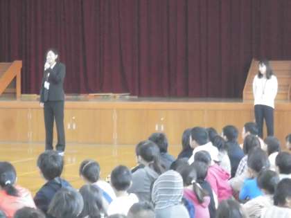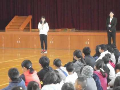 今日はなかよし集会で全校が体育館に集まりました。まずは,11月から新しく来た先生と教育実習生の紹介がありました。