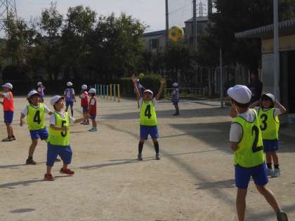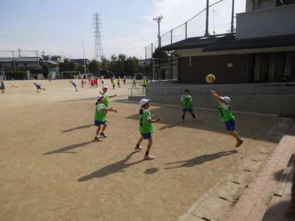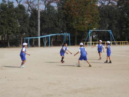 体育ではパスゲームに取り組んでいます。チームごとに分かれて練習しています。お互いに声を掛け合いながら,パスをし合っていました。