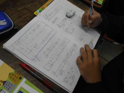 校内の授業研究会。今回は,4年生の算数「もとの数はいくつ」の学習です。問題を読んで,自分はどう考えるか,図を使いながらノートにまとめていきます。関係図やテープ図などこれまで学習してきたことを使って,みんな考えを進めていました。