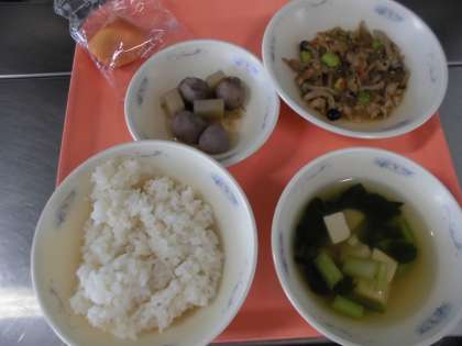 胚芽米ごはん・牛乳・きのこごはん(具)・里いもとこんにゃくの土佐煮・すまし汁・柿