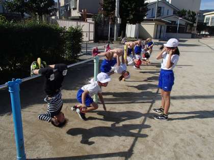 というのは,具合が悪いわけではなくて,今日から体育科で取り組み始めた鉄棒での成果でした。前回りから逆上がりまで,苦手な子から得意な子まで,友だちと補助したりアドバイスしたりしながらすごす子どもたち。チームワークも軌道に乗っています。