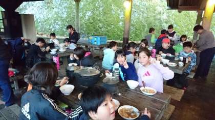 野外炊飯が無事終了しました。みんなでおいしくいただいています。