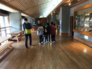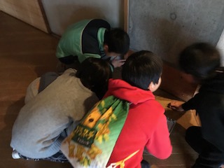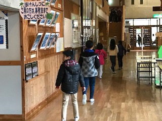 館内ウオークラリーの様子です。壁などに貼ってあるシールとことばを探しながら歩くことで、山の家の館内に詳しくなることを目指します。グループで仲良く活動することも目指します。