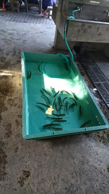 魚さばきです。所員さんから、「さばく」=「殺して命をいただく」ことだというお話を聞きました。みんな、真剣な表情で聞いていました。