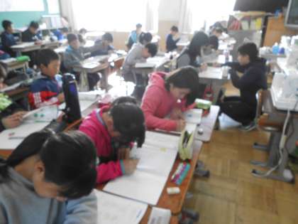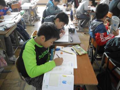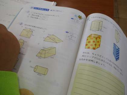 算数では「立体の体積」の学習をしていますが,今日は復習の時間です。計算が複雑な問題もありますが,みんな集中して取り組んでいました。