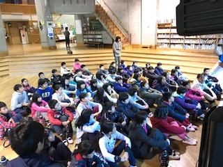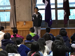 おはようございます。朝のつどいに集まりました。全員元気です。今日は登山です。天気は今のところ晴れで、朝日が差しています。