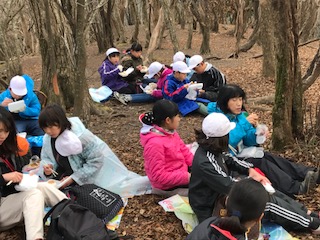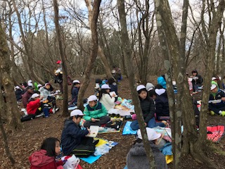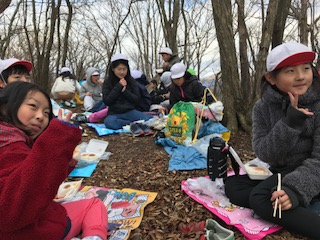 頂上でおにぎり弁当を食べました。日差しもありますが、かなりの寒さです。