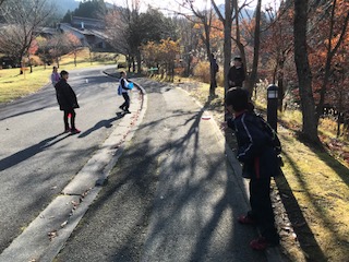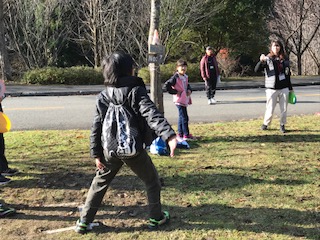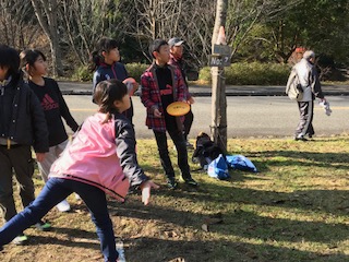 あたたかい日差しの下で、一つのクラスは、フライングディスクゴルフから始まりました。フリスビーを何回で的に入れられるかで得点を競います。楽しんでいました。