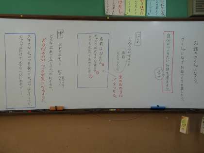 国語ではお話づくりを頑張っています。はじめ・中・終わりの構成を考えながら,楽しいお話になるようにしていきました。