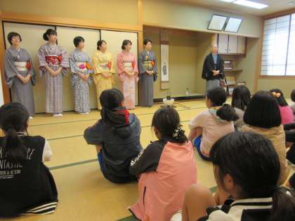 京都芸術協会の方々にお世話になり,抹茶体験教室がありました。まずは,お茶の道具を説明していただきました。