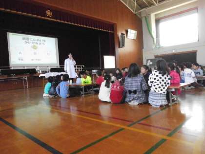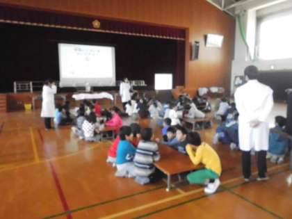 企業の方に来ていただき,いろいろな実験を通して,食品が姿を変える様子を観察しました。国語の「すがたをかえる大豆」の学習と関連しての,今日の出前授業でした。においをかいだり,様子をじっくりと観察したりして,とてもいい体験になりました。