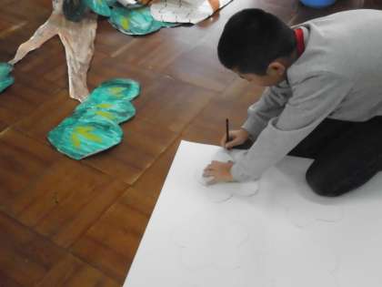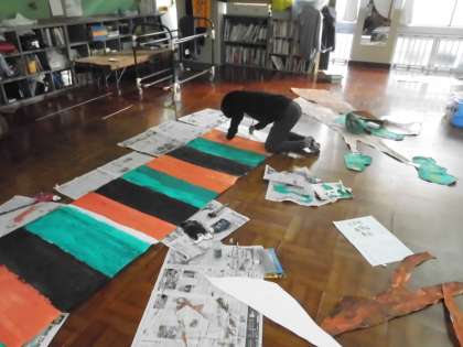今日も舞台背景作りに取り組みました。二人で役割分担して頑張っています。本番まであと一週間。ファイトです。