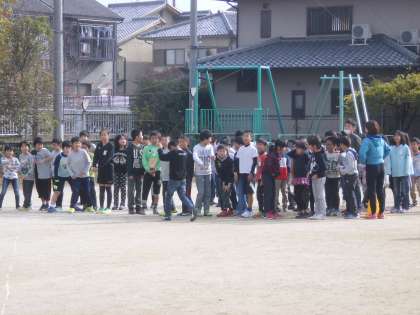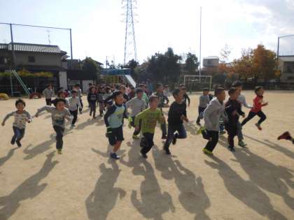 今日から中間マラソンが始まりました。約5分間,自分のペースで走ります。今日は走るには少し暑いぐらいのいい天気のもとで,みんな元気に走っていました。