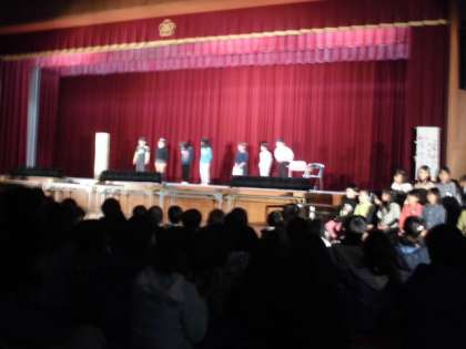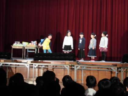 2年生は劇『大すき いっぱい うめきたの町』。生活科の学習で校区探検をしましたが,探検してわかったことを創作劇にしてスライドも流しながら発表しました。校区探検の際に教えていただいた地域の方々にも,発表を見ていただきました。