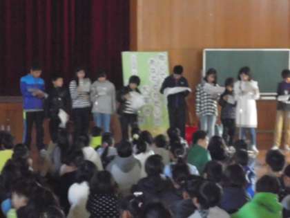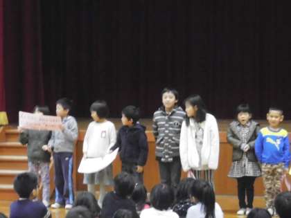 各クラスの代表委員から,クラスで考えた人権標語が発表されました。「笑顔」「思いやり」など,いくつか人権に関わるキーワードが出てきました。また,図書委員による絵本「かたあしだちょうのエルフ」の読み聞かせもありました。みんな真剣に聞き入っていました。
