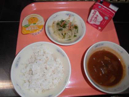 麦ごはん・牛乳・ビーフストロガノフ・じゃがいものソテー・みかんゼリー