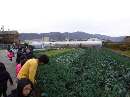 この日の3校時は,久々に校区に校外学習に出発しました。行き先は何という事もない,学校の裏の畑です。着いたとたんにガードレールから身を乗り出し,一面に広がる畑を見渡して歓声を上げます。いつも集団登校で通っている子もいると思うのですが,改まってみんなで学習に来ると,その発見のうれしさもひとしおです。