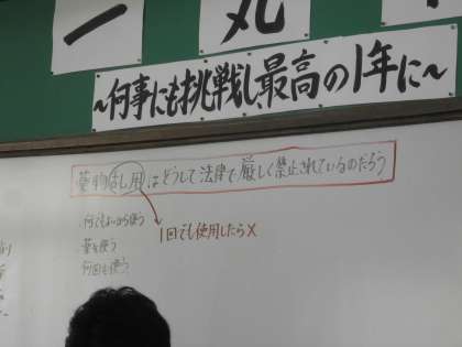 保健では,薬物についての学習です。最近のニュース報道などでも耳にすることがよくありますが,その危険性について,みんなで学習しました。