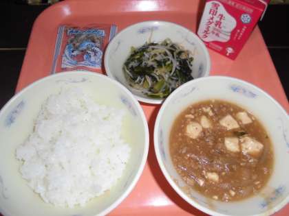 ごはん・牛乳・マーボどうふ・ほうれん草ともやしのいためナムル・じゃこ