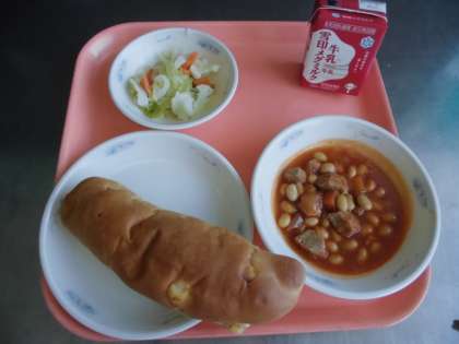 『ポークビーンズ』は、アメリカの家庭料理の一つで、豚肉と豆をトマトで煮込んだものです。アメリカでは、白いんげん豆を使う事が多いです。給食では、大豆を使っています。豚肉も大豆も「体をつくる」たんぱく質を多く含んでいます。