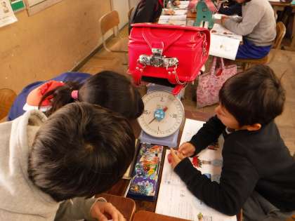 算数科「重さ」では,1000gを超えるもの(ランドセル)を測って,1kgという事を学習しています。