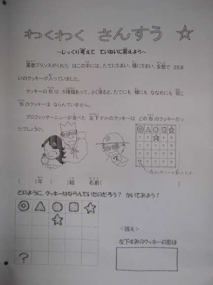 今日からわくわく算数ウィークが始まりました。フェアリーやプリンス,プロフェッサーニューから,全校に算数クイズが出題されました。早速に挑戦し,解答できた人もいるようです。今回は何人ぐらいの人がクイズを解答できるのでしょうか。皆さん,ぜひチャレンジしてくださいね。
