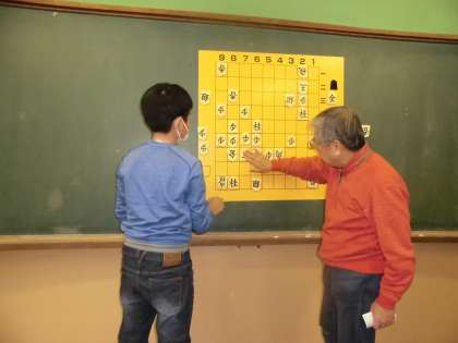 いつものように対戦するだけでなく、大判将棋を使って個人的に教えてもらうこともできました。今日の講義のテーマは、「玉は下段に落とせ。」。実際の対戦の棋譜を参考にした難しい問題を考えました。